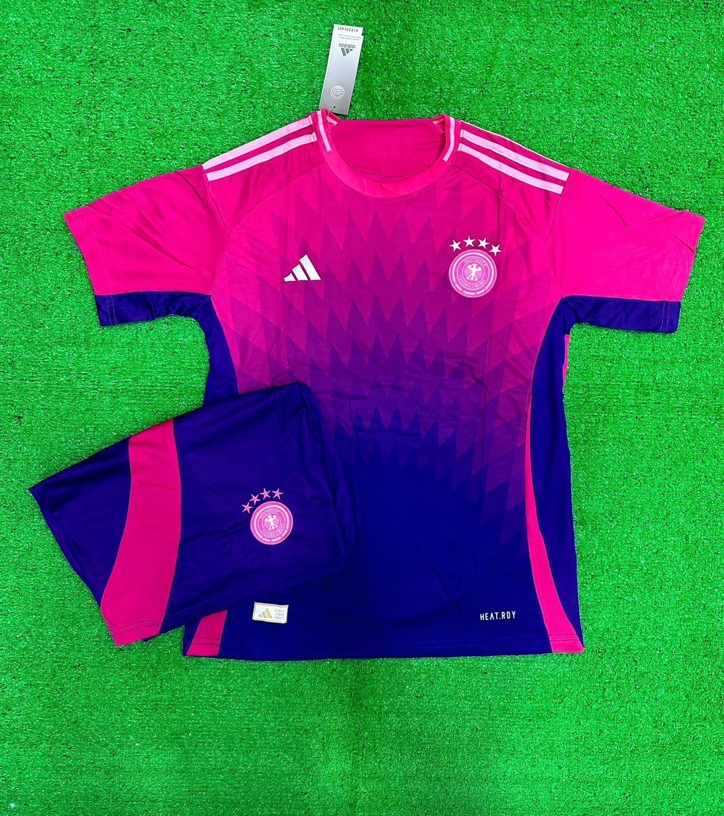 Support Germany in style with the Germany Away Set (Jersey and Shorts) 2024. This high-quality set is crafted with breathable, lightweight fabric to keep you cool and comfortable whether you’re on the pitch or cheering from the stands. Designed for both performance and everyday wear, it’s a must-have for true Germany fans.